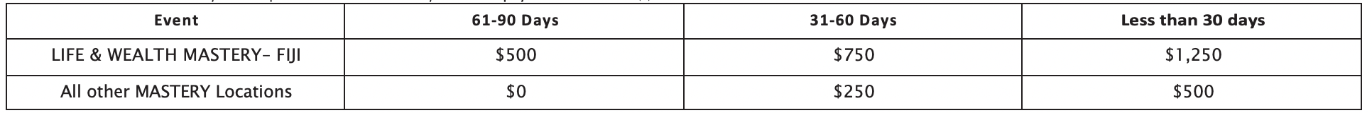 D. Minimum Tuition: Unless otherwise waived based on your credit approval rating, as determined solely by RRI, if enrolled in MASTERY UNIVERSITY, your monthly payments plus your initial deposit must total the tuition for the applicable session 60 calendar days in advance of each session as follows: LIFE MASTERY: 27.5% of your total Mastery University tuition; DATE WITH DESTINY: 50% of your total Mastery University tuition; WEALTH MASTERY: 22.5% of your total Mastery University tuition. For the Finance Plan, if offered by RRI, at least$10,685 of your tuition (inclusive of interest payments) must be paid prior to attending your final session. For specific payment amounts and due dates, please contact your Personal Results Specialist at our office.